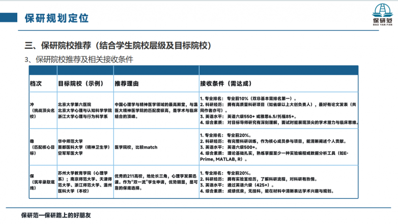 据了解,每一位学员签约后,保研范都会第一时间为其搭建专属的“双师护航”服务团队——由全程跟进的专属班主任,与目标专业对口的top院校上岸学科导师组成。服务启动的第一步,便是全面的学情深度诊断:从本科院校背景、绩点排名、英语成绩、科研竞赛经历等硬实力,到目标院校与专业方向、个人短板与优势,再到性格特点、时间规划能力、心理承压能力,全部纳入评估维度。
